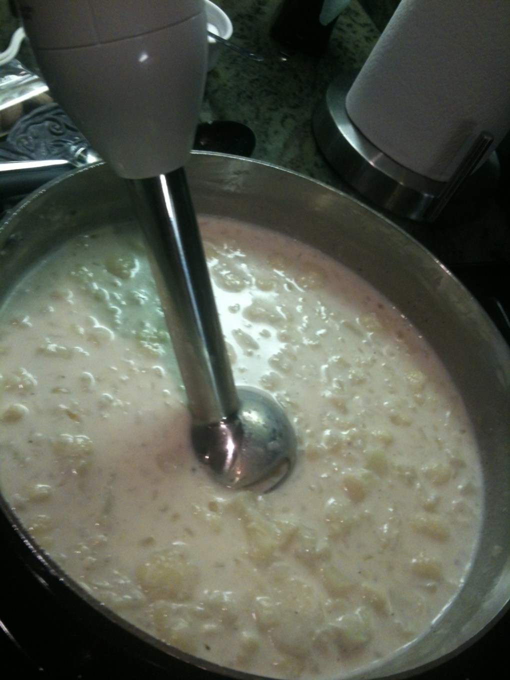 - Gradually stir in milk; bring to a boil. Reduce heat; gently simmer until cauliflower is very soft, about 15 minutes. Season with salt and pepper to taste (I used about a teaspoon and a half of kosher salt). Blend the cauliflower mixture until smooth (either with an immersion blender or in a regular blender). Add one cup of the parmesan and all of the gruyere and stir to melt. Add the broccoli florets, ham and chopped parsley and mix will.