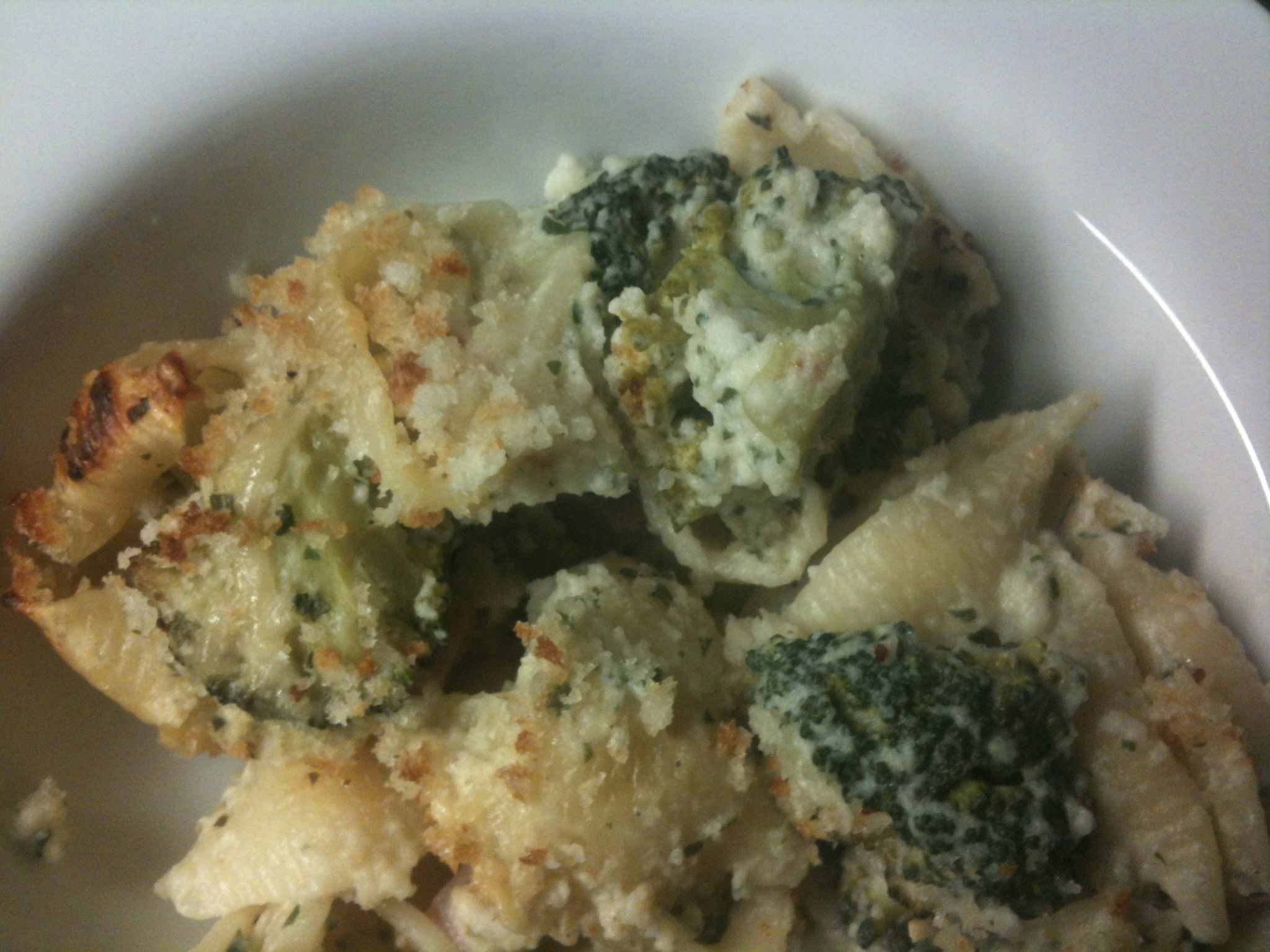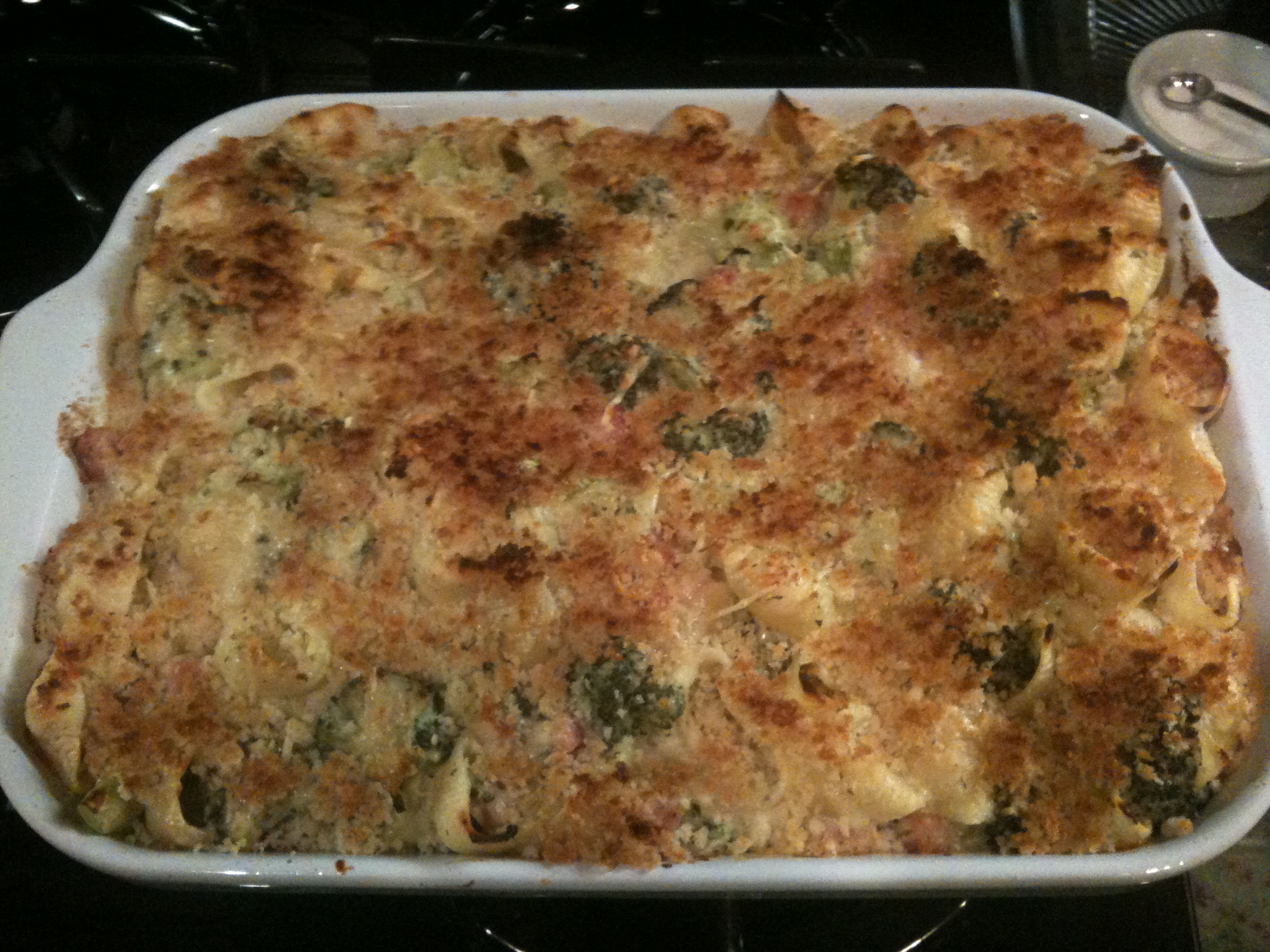 - Preheat oven to 400 degrees. Meanwhile, bring a large pot of water to a boil. Cook pasta until slightly tender but not fully cooked, about 5 minutes. Drain well; return to pot. Add ham, broccoli, and cauliflower sauce; toss to combine. Transfer to a ovenproof 3 1/2-quart baking dish sprayed with Pam. Sprinkle with remaining parmesan cheese, cover with foil and bake until bubbling in center, about 30 minutes. Remove foil and bake another 5 – 10 min. Sprinkle the Panko bread crumbs mixed with melted butter over the top and cook under the broiler until golden brown on top, 1 to 2 minutes. Let cool for 5 minutes and serve!
