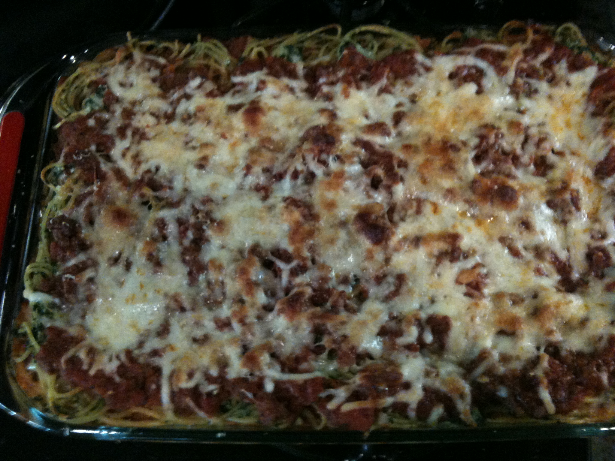 Spaghetti Casserole with Spinach Pesto and Meat Sauce