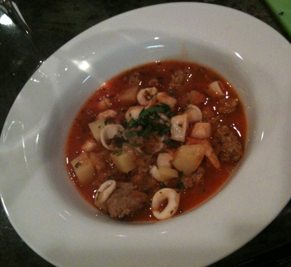I made this last week when my brother-in-law and sister-in-law were visiting. We had a bit of gloomy weather and I wanted to make some comfort food. This dish is very similar to a cioppino (Italian Seafood Stew), but a little simpler to make. It does take a while to cook…it needs some time on the stove for the flavors to develop and the wine to mellow, but you can do almost all of it ahead of time so it is a great dish for company. I used a seafood blend that I found a local seafood shop that had a mix of calamari rings, shrimp, and bay scallops. They also sell a mix like this at Trader Joe’s. The addition of spicy Italian sausage to this gives it great flavor. Don’t leave out the fennel…it really adds something to this dish! If you haven’t cooked with fennel before…here is a good video I found that shows you how you trim and prep a fennel bulb: http://www.youtube.com/watch?v=Woq5xV7G_N0