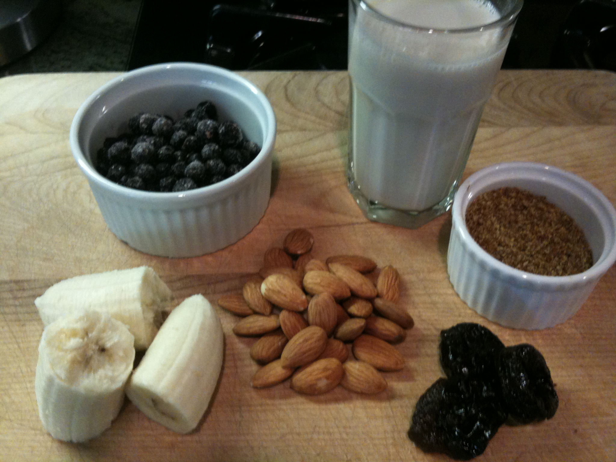 Or anytime shake! I actually made this for lunch the other day. I was experimenting with ingredients and this combo was great. The prunes (don’t let them scare you!) added a delicious sweetness along with some fiber and potassium. The almonds give you a great protein boost and you get good heart healthy omegas from the flax.