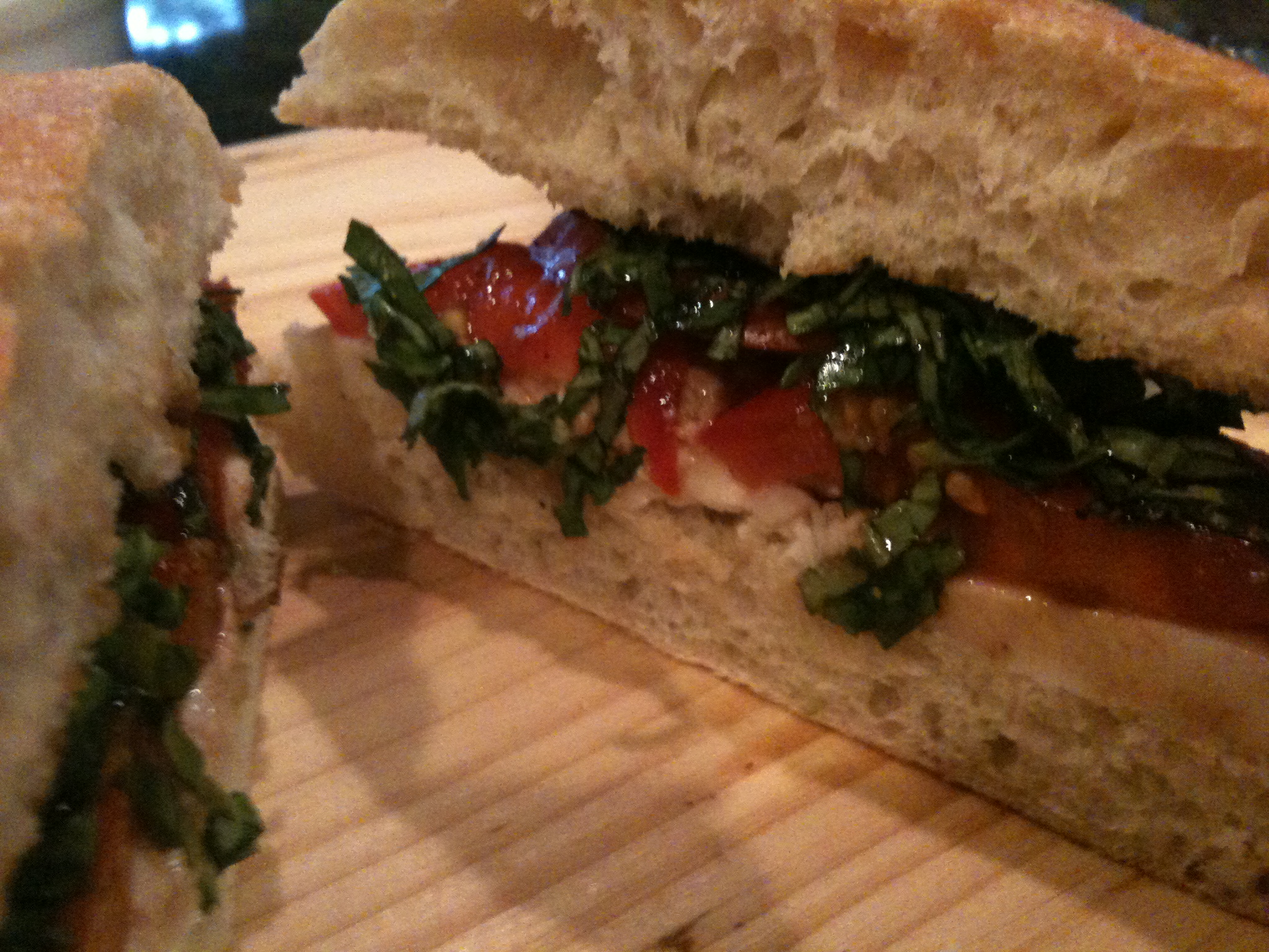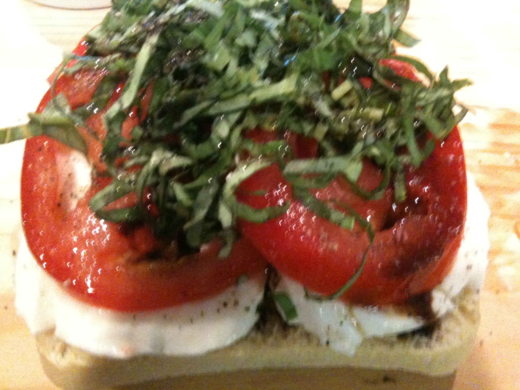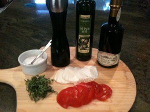 You need some sliced tomato, sliced fresh mozzarella cheese, thinly sliced fresh basil, a little olive oil (he likes Trader Joe’s Roasted Garlic Olive Oil), a drizzle of aged balsamic vinegar, Kosher salt and fresh ground pepper. Oh…and some good crusty bread.
