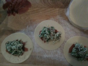 Place a couple of strips of prosciutto onto the empadada wrapper then top with a couple of spoonfuls of filling