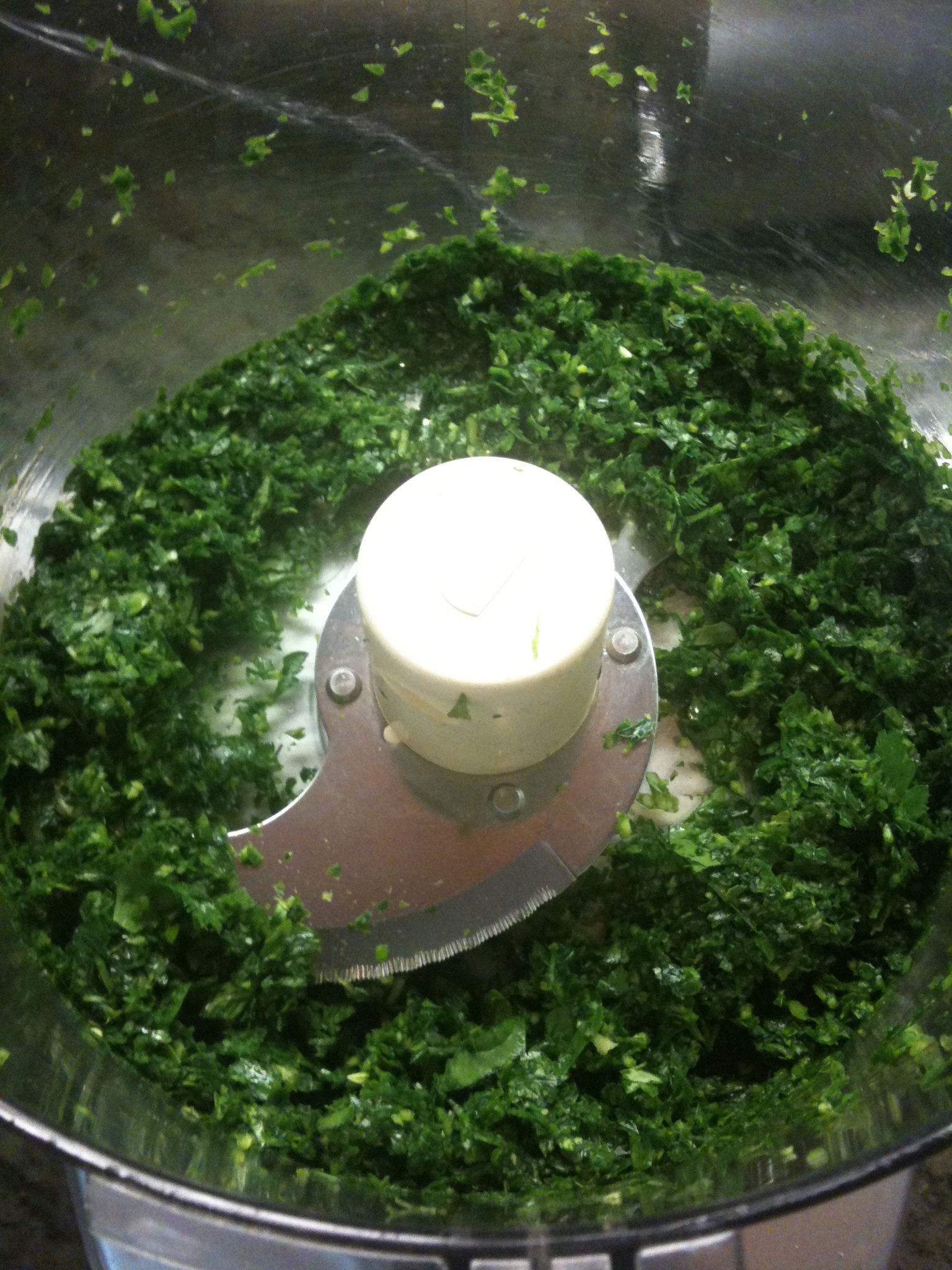 The food processor makes quick work of the basil, parsley, and garlic. You can chop all of these by hand if you want, but this makes it much quicker!