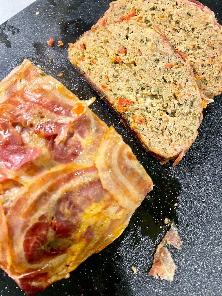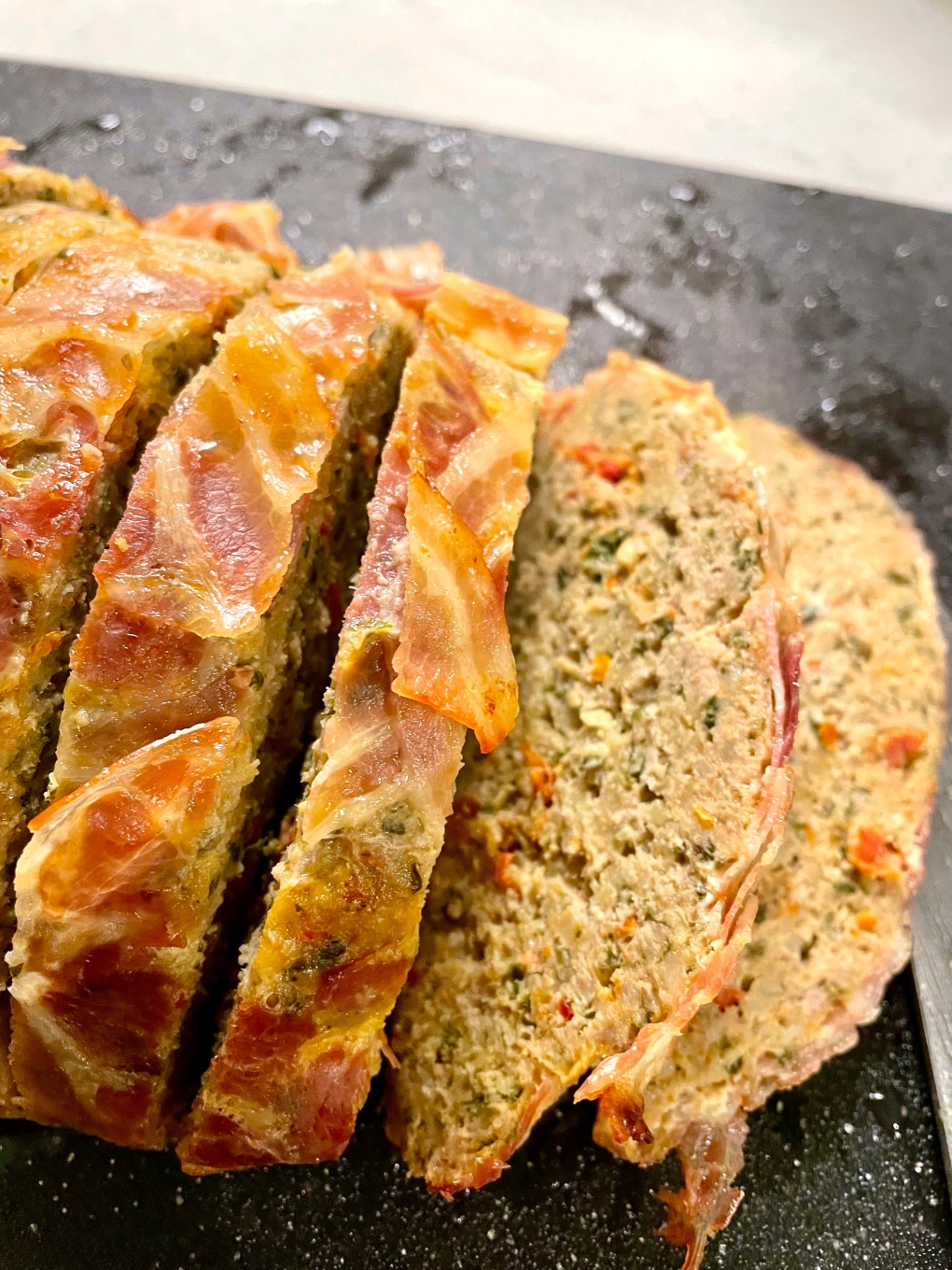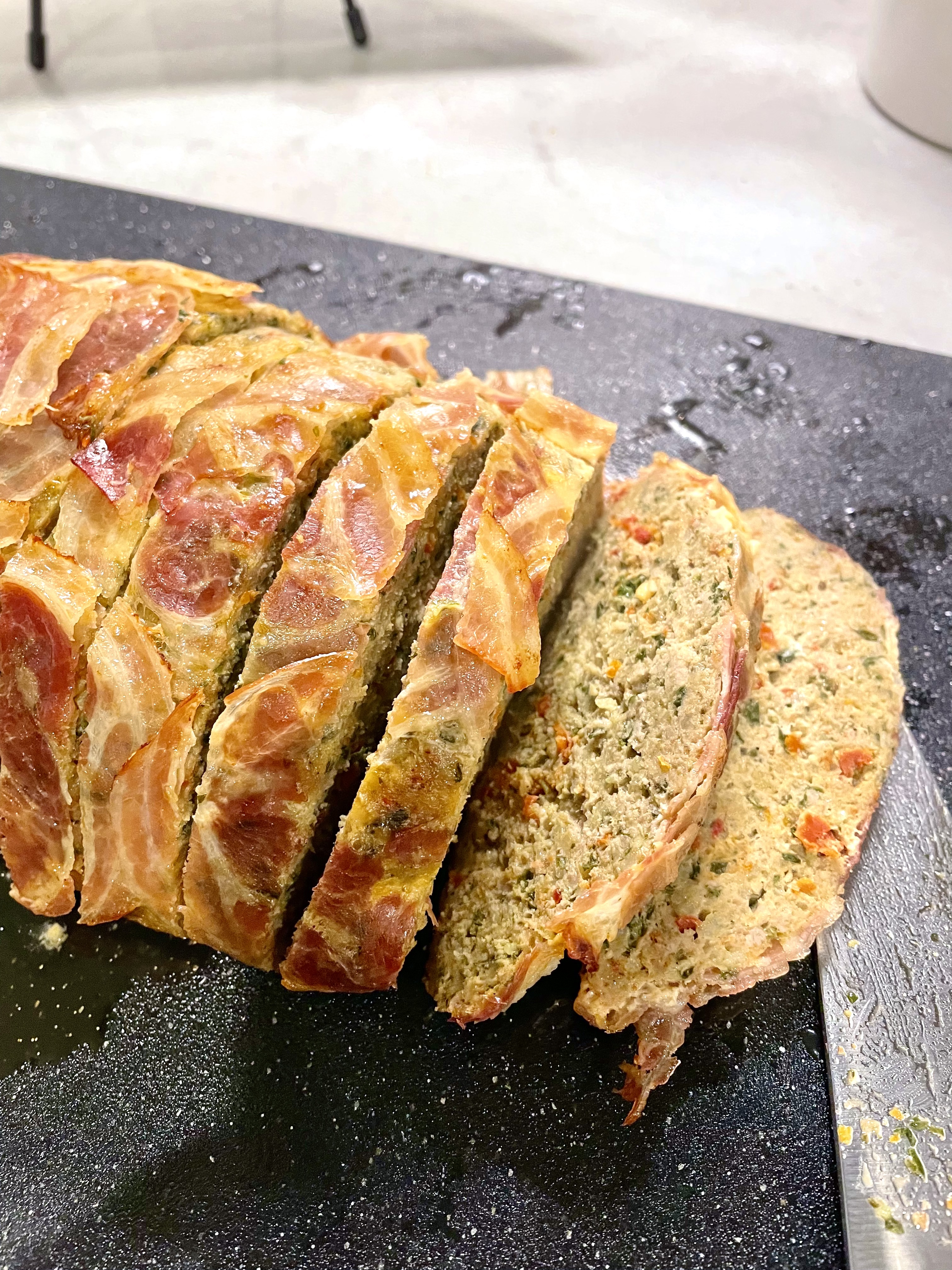Line a baking sheet with heavy duty foil (makes for easy clean up!) then with a large piece of parchment paper. Transfer your meat mixture to the parchment paper and form into a loaf. Top the meatloaf with the sliced pancetta making sure the whole loaf is covered. Wrap the parchment over the loaf and fold up on the ends to secure. Bake the loaf until the internal temperature reaches 165 degrees F on an instant-read thermometer, about an hour and 10 minutes. Remove from the oven and let sit for about 10 minutes before slicing and serving.