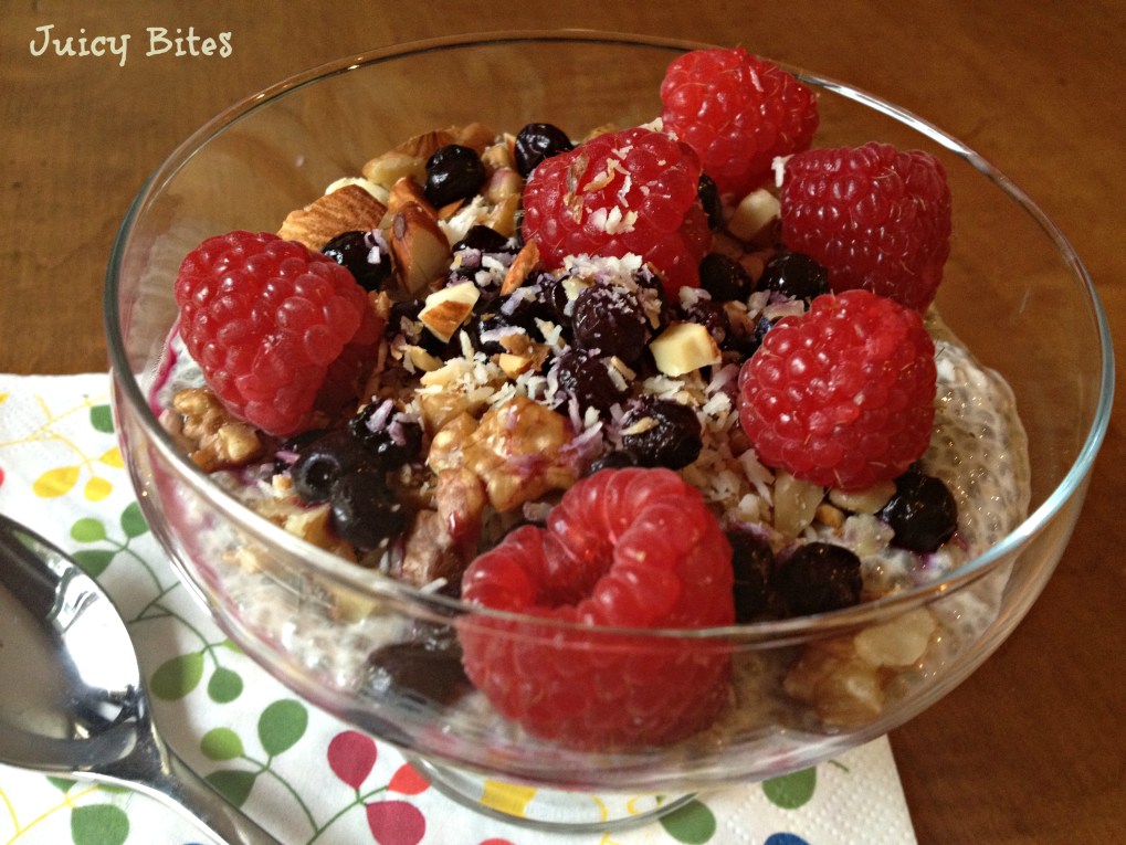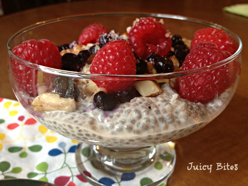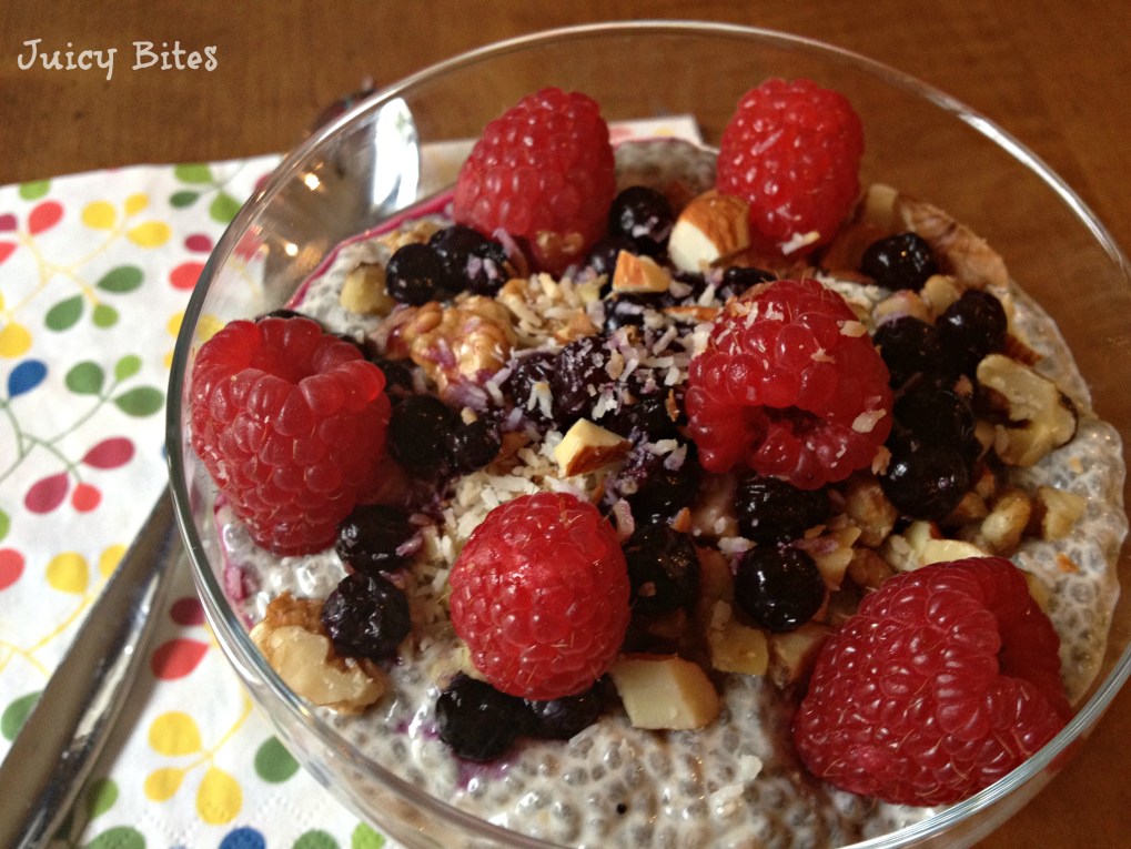 Hey Juicy queen, this was soooo yummy, I had it this morning! I kept wanting to try it but the ungodly cost of chia seeds was deterring me. Trader Joe’s just started carrying them for a decent price so I picked up a bag. I blended my almond milk with a frozen banana, and topped it with strawberries, pomegranate seeds and chopped almonds. Simply delish!!! Thanks for the fun breakfast!