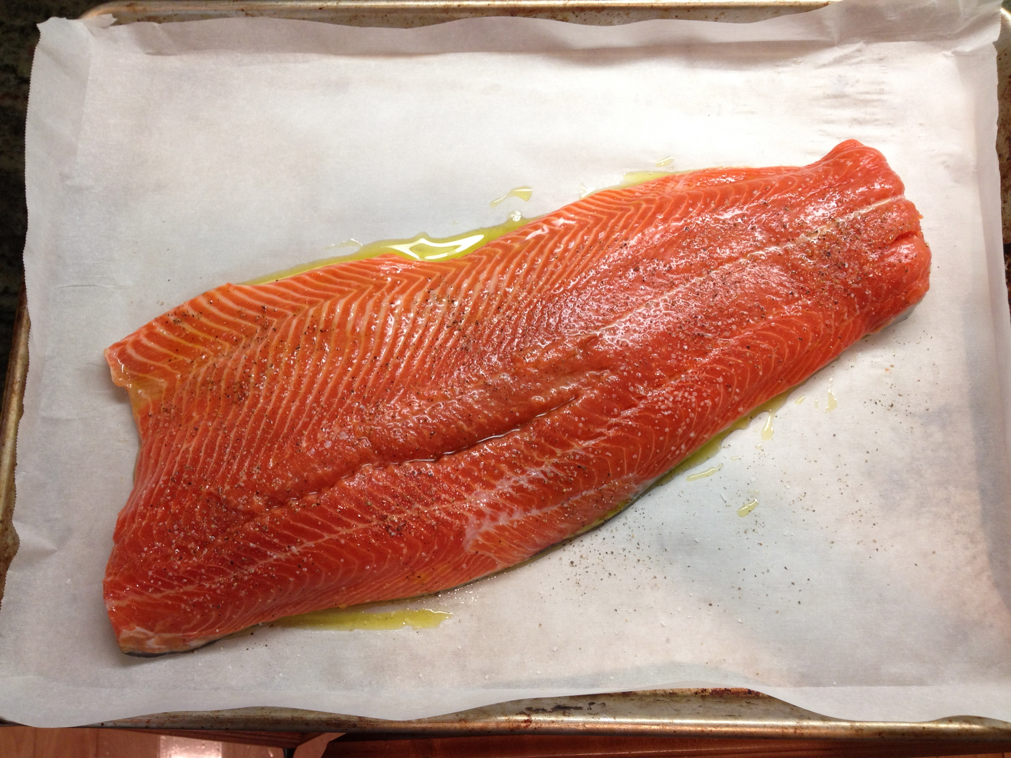 Put your oven rack in the center of the oven and pre-heat to 425. Cover  a large cookie sheet with parchment paper. Rinse and pat salmon dry. Lay skin side down on the parchment and coat with olive oil. Season with salt and pepper. Roast for about 10-15 minutes. Mine took 15 and was cooked perfectly.