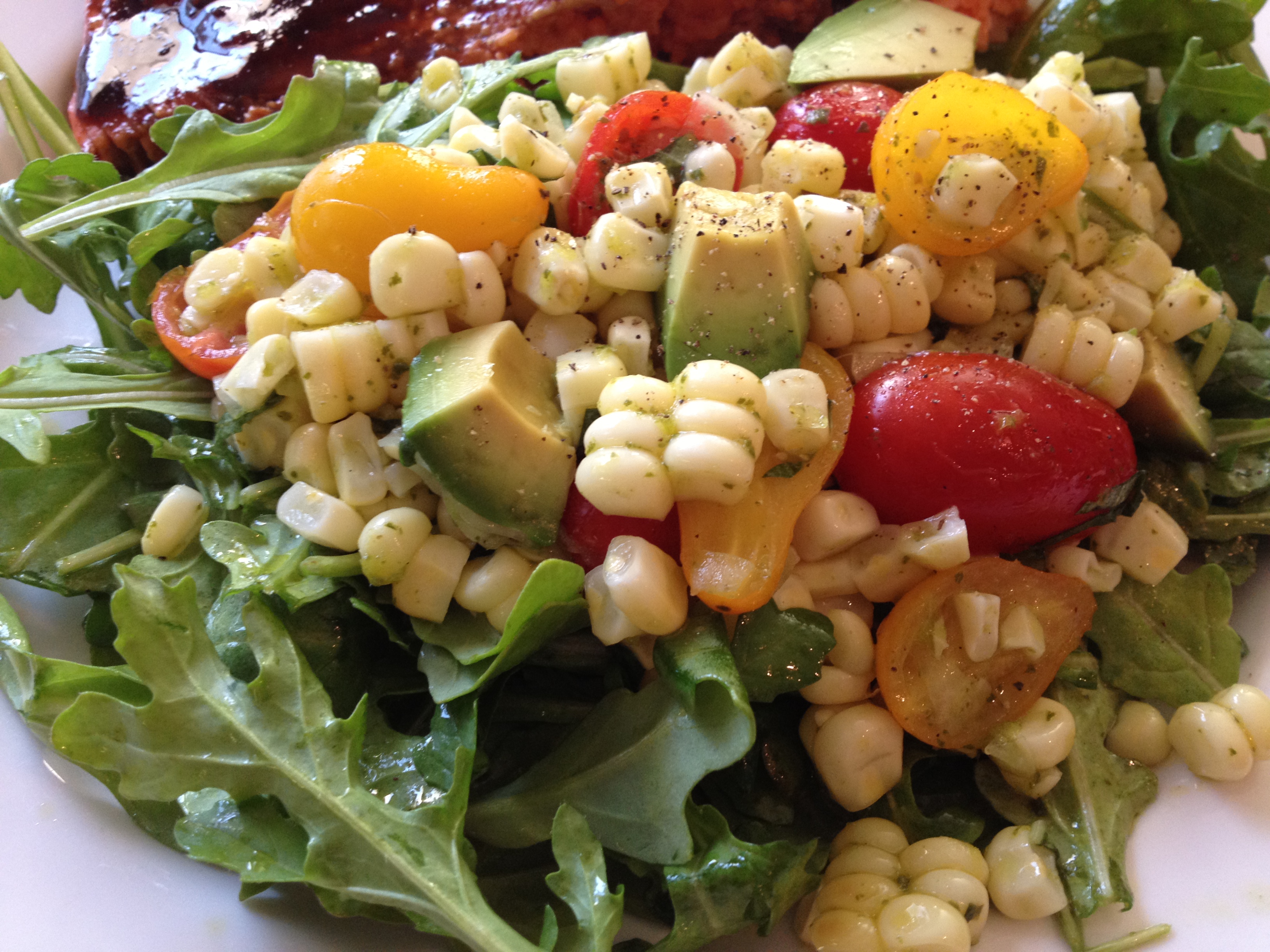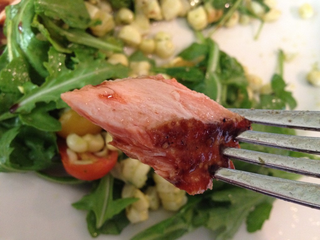 Balsamic-Soy Glazed Salmon with Corn and Tomato Salad over Arugula