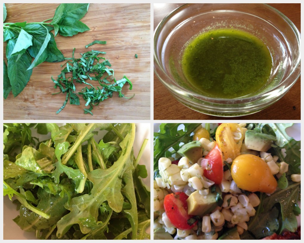 Toss the remaining basil dressing with 4 cups of arugula. Divide the arugula onto plates and top with some of the corn salad, garnishing with the sliced basil. Cut the salmon into 4 filets and put next to the salad. Drizzle more of the Balsamic-Soy Glaze over the salmon. Serve immediately.
