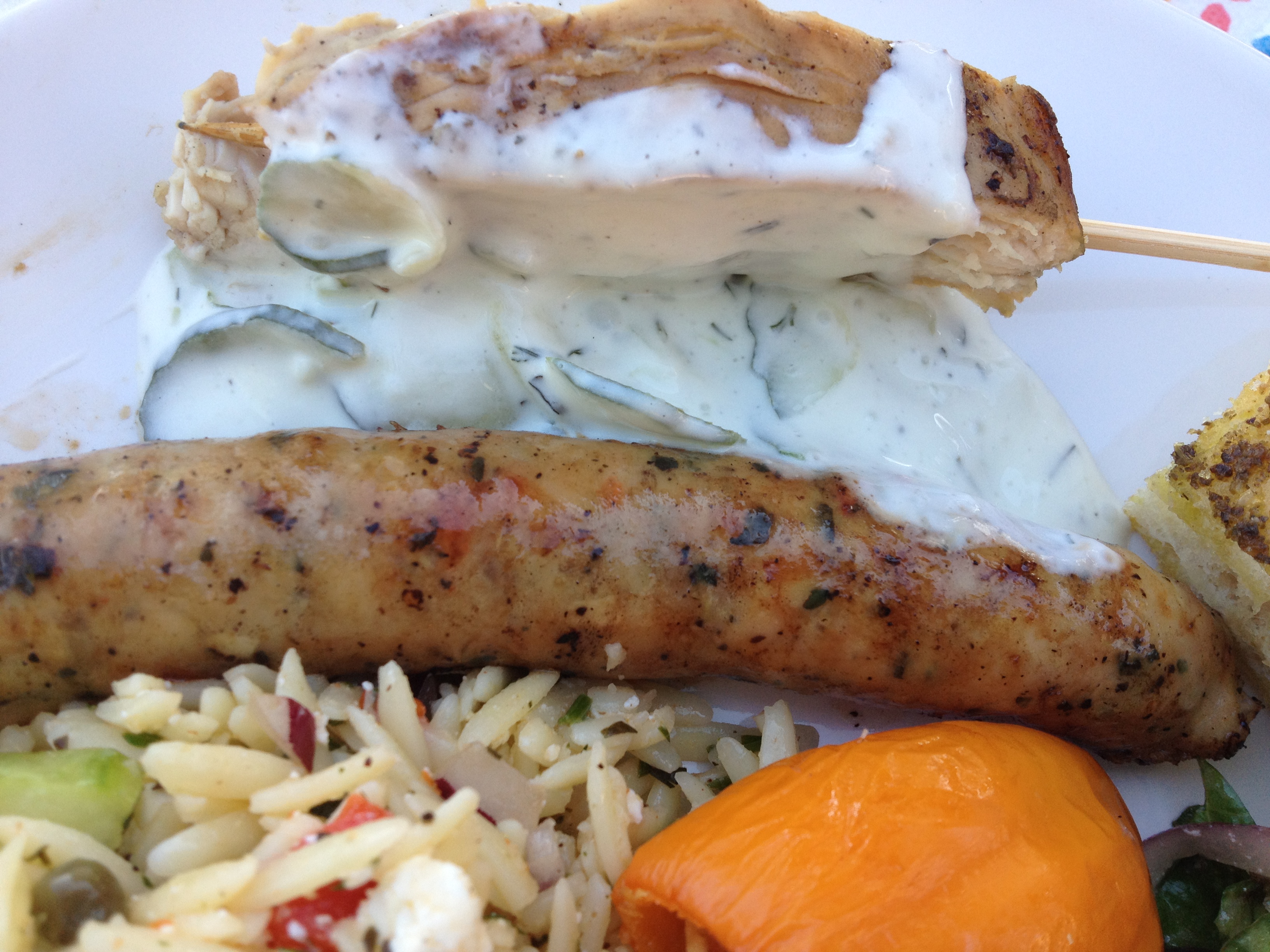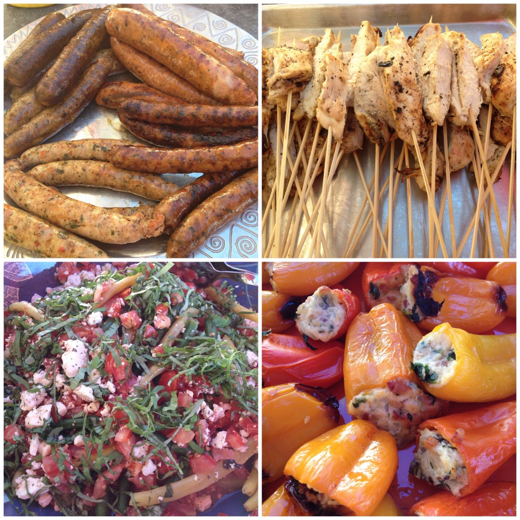 From the grill we had an assortment of gourmet sausages from Whole Food’s Market. They were delicious and cook up so quick and easy. We also had some grilled Lemon Chicken Skewers that we served with Tzatziki Sauce. The chicken is a simple recipe that I love from Ina Garten (AKA: The Barefoot Contessa, and one of my cooking idols). Her recipe is served with a satay dip, which is also delicious.