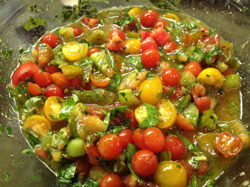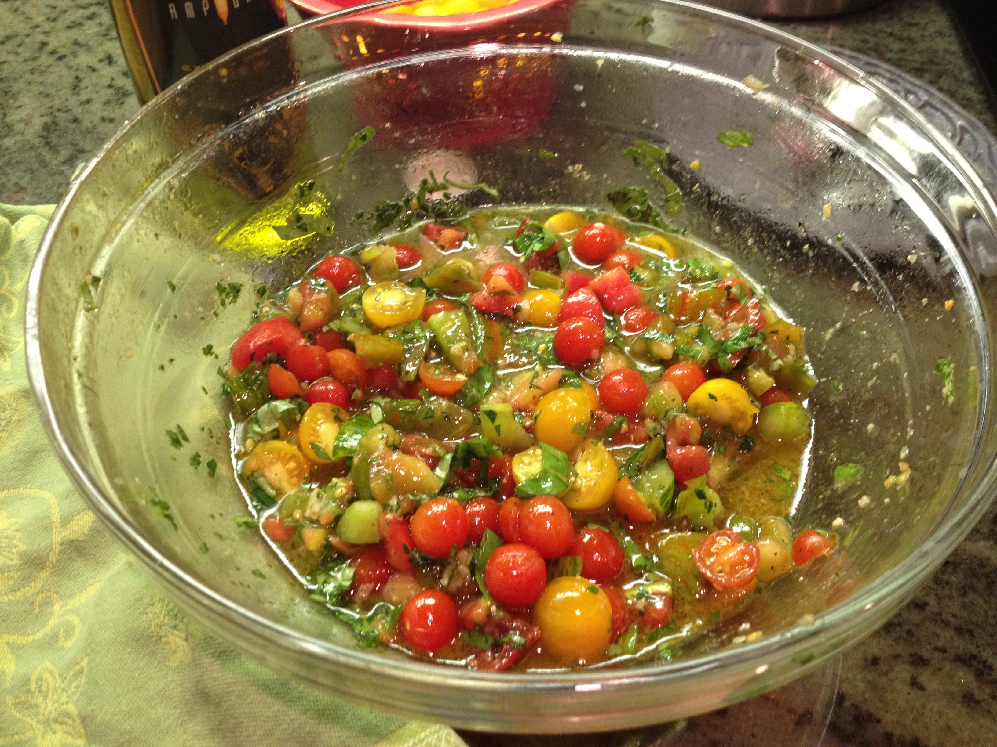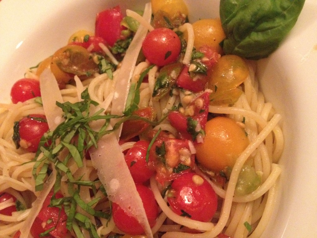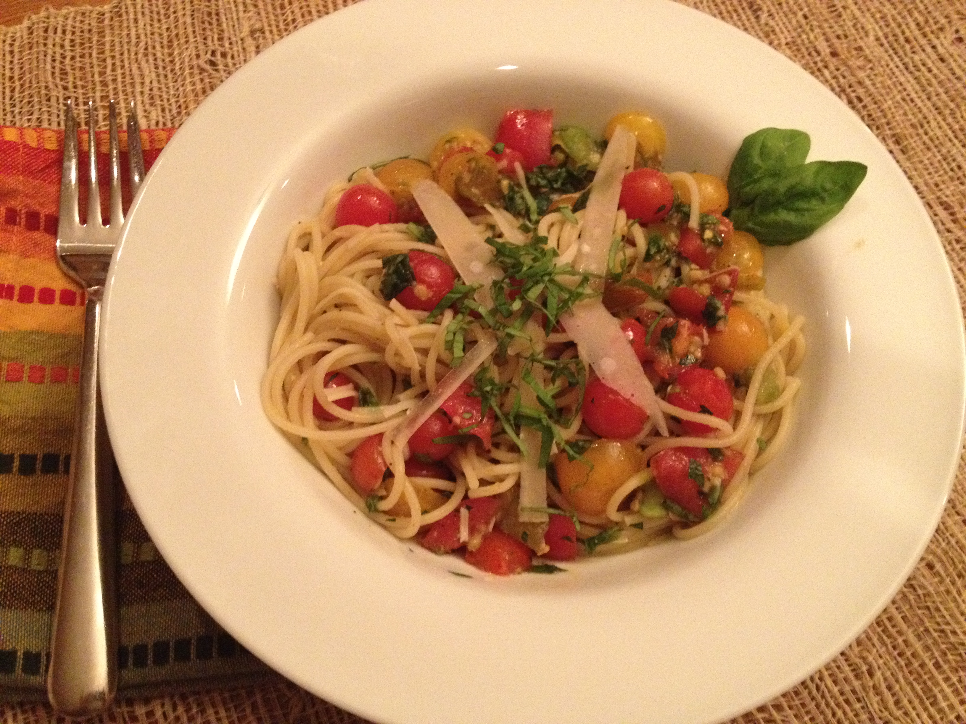 Roughly chop the bigger heirlooms and cut small tomatoes in half. Be careful to save any juice that they give off onto the cutting board. Combine the tomatoes, olive oil, basil, parsley, garlic and salt & pepper in a large bowl. Mix well and cover with plastic wrap for at least 30 minutes (mine sat for about 45 min). In a large pot of well salted boiling water, cook your spaghetti until al-dente. Before you drain, reserve a little of the pasta water. Drain and toss with the tomatoes. If it is a little dry, you can add some of your reserved pasta water. Taste for seasoning…you may need more salt and pepper.