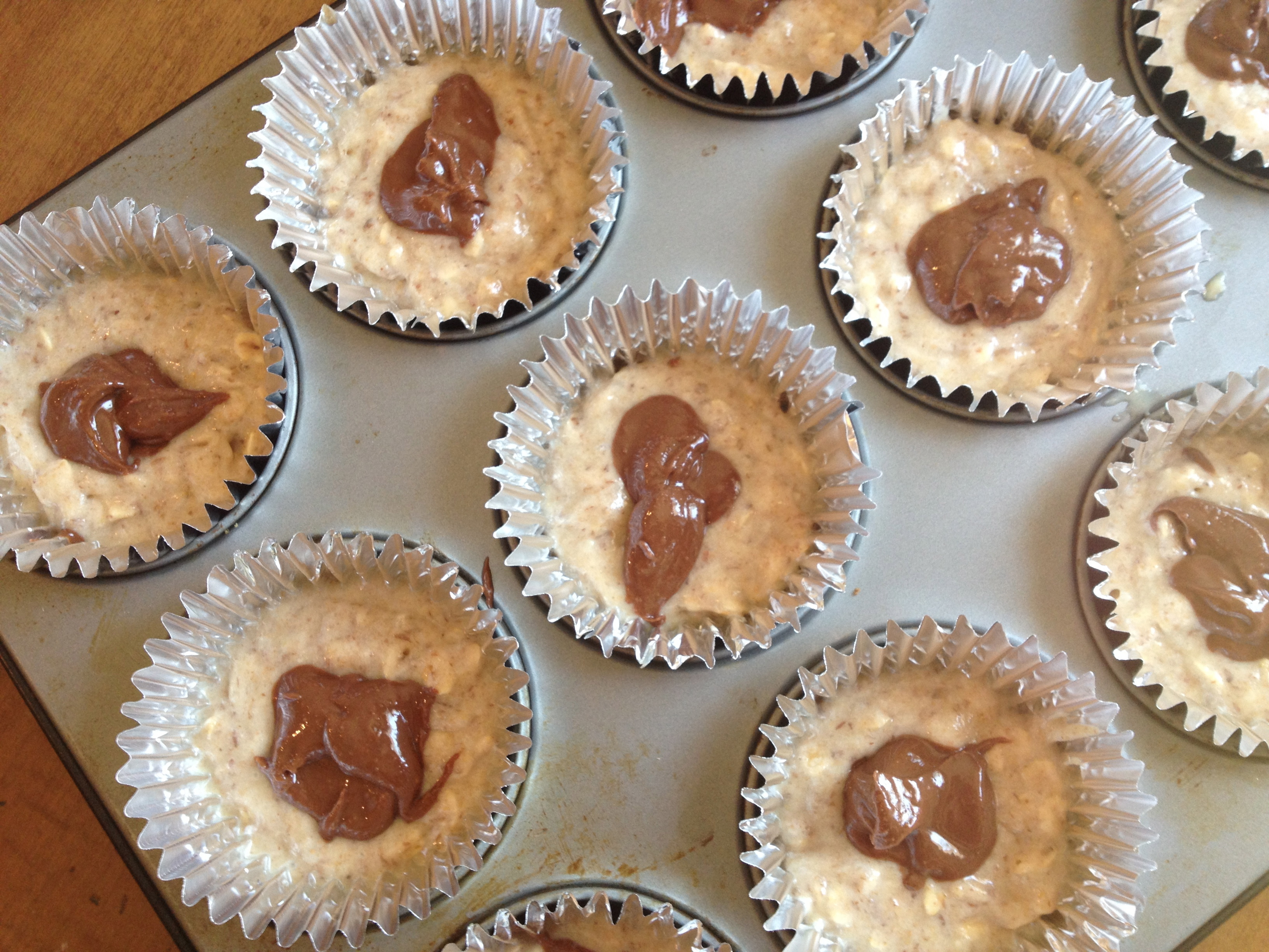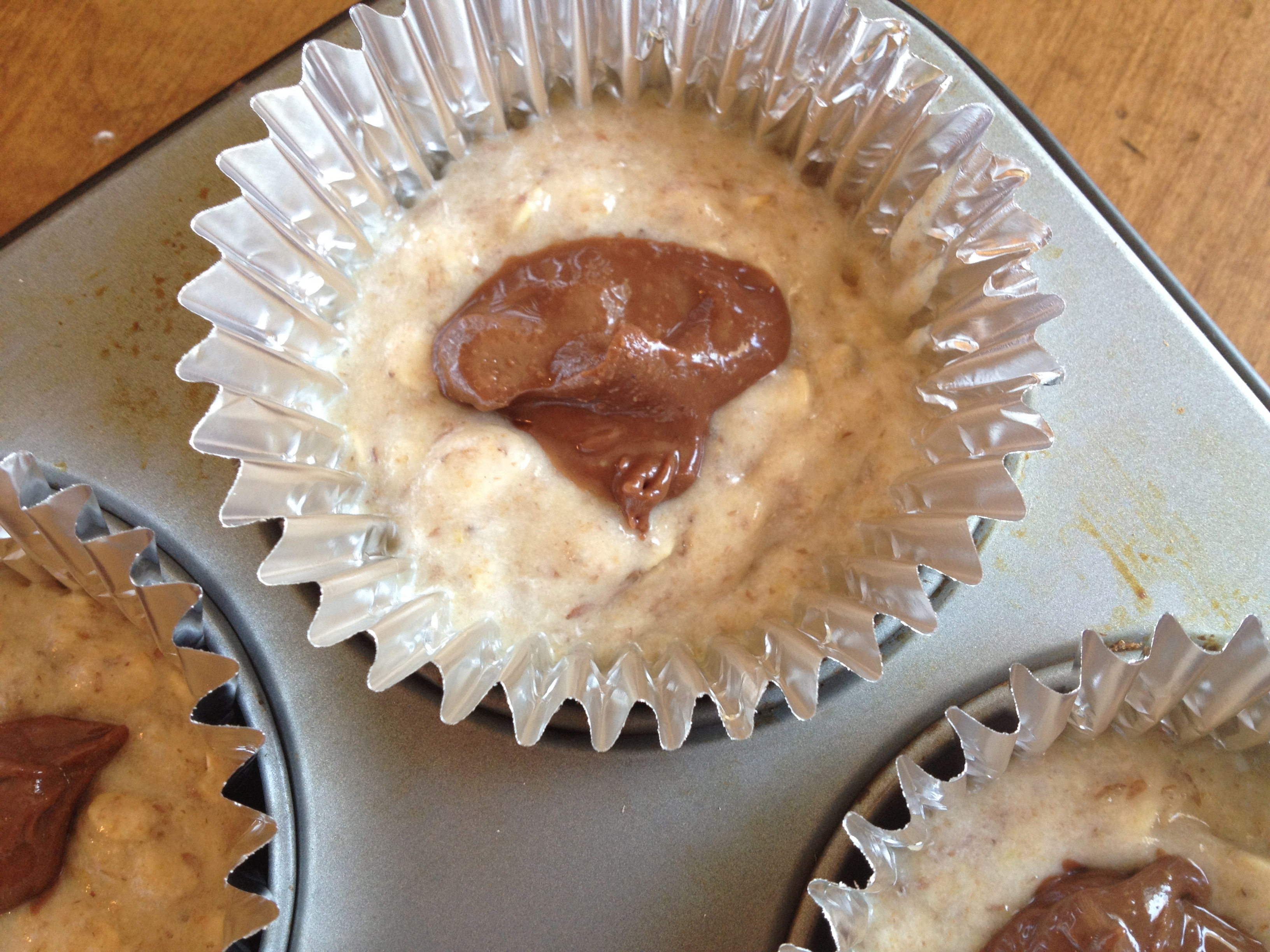 All I did was fill the muffin cups 1/2 full with batter, then add a spoonful of the chocolate almond butter to the center before filling them up the rest of the way.