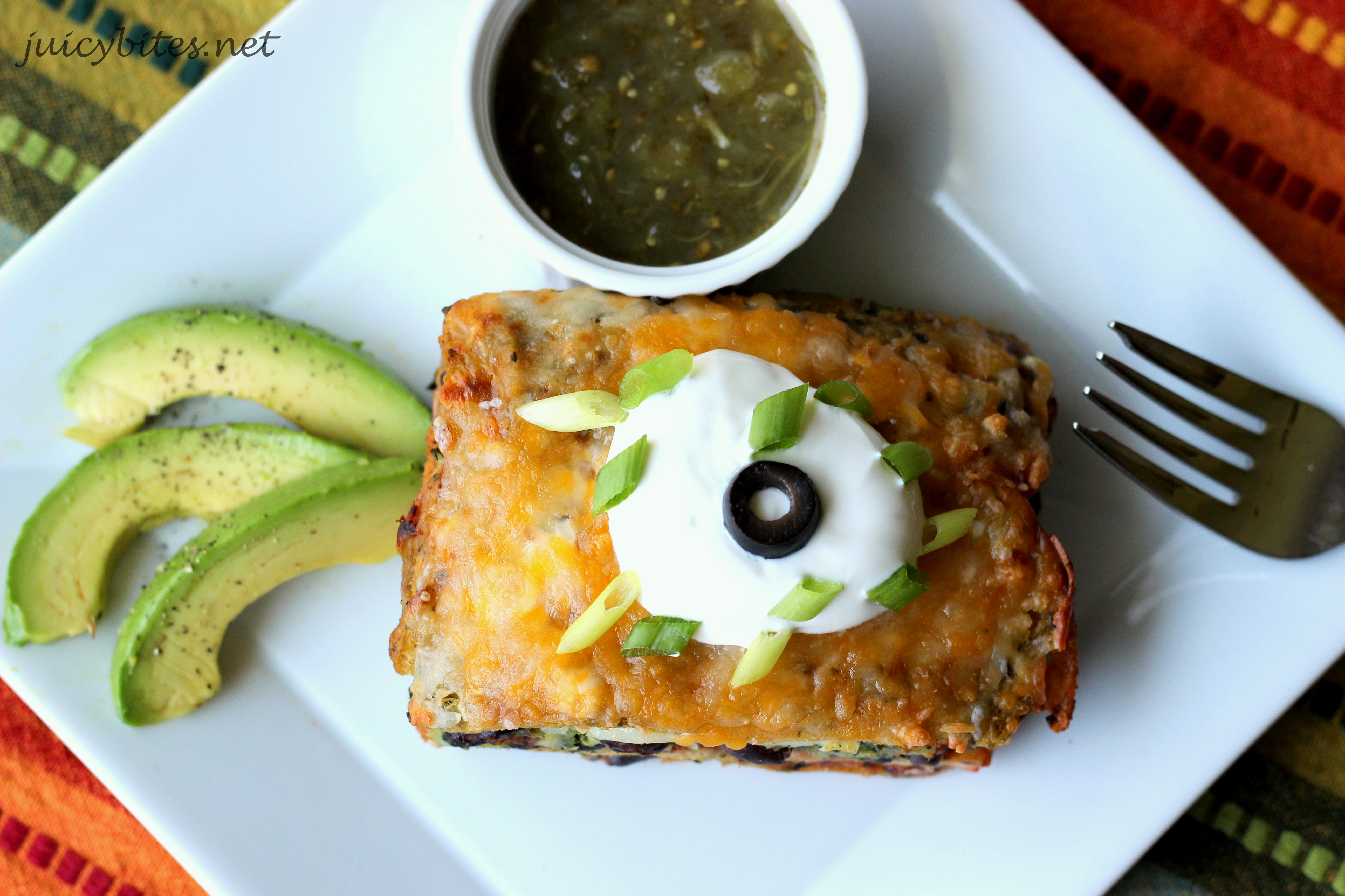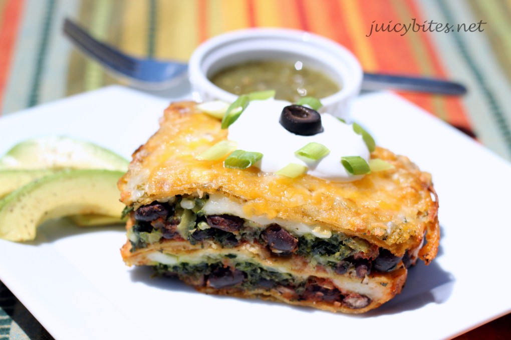 Layers of black beans, spinach, zucchini, queso fresco, and salsa are nestled between corn tortillas. The prep is pretty easy on this, just a little chopping here and sauteing there. The salsa is store bought, so no sauce to make.  Just make sure you use a good salsa that you know you like. It is a big part of the flavor in this dish.  I used a combo of red and green salsa because I didn’t have enough of either one. Either would be great, just go with what you prefer. Then…the oven does it’s magic. All of the yummy flavors meld together and the cheese gets bubbly.