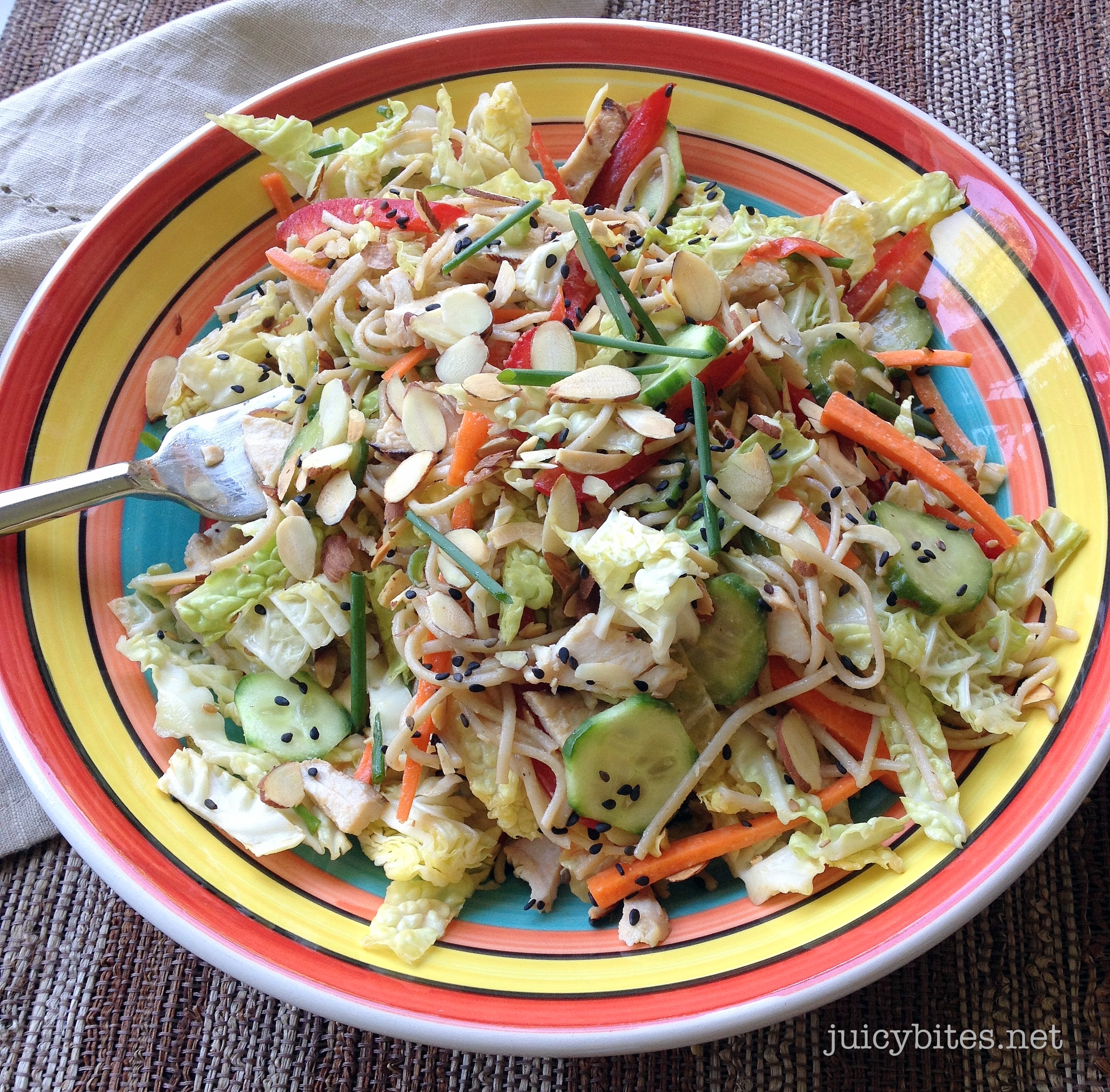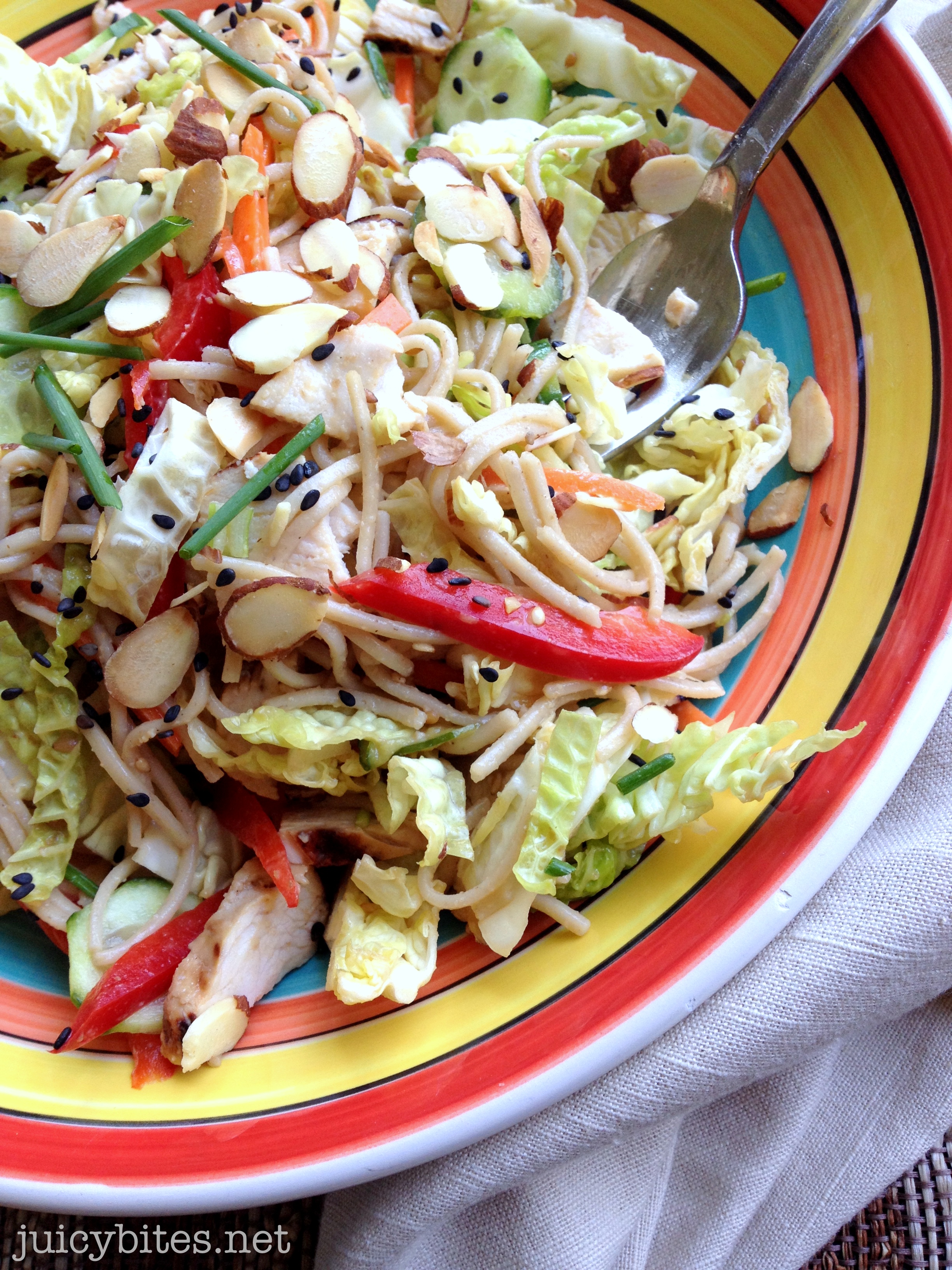 The creamy peanut dressing in this is soooo good! Oh yeah…that is another change I made. Giada uses almond butter and I went with peanut butter. I think both are great, but my kids prefer peanut butter. If peanut dressing is not your thing or there are peanut allergies in your family, any Asian dressing would be good. Heck, just a mix of soy sauce, rice vinegar, sesame oil and olive oil would be delish!