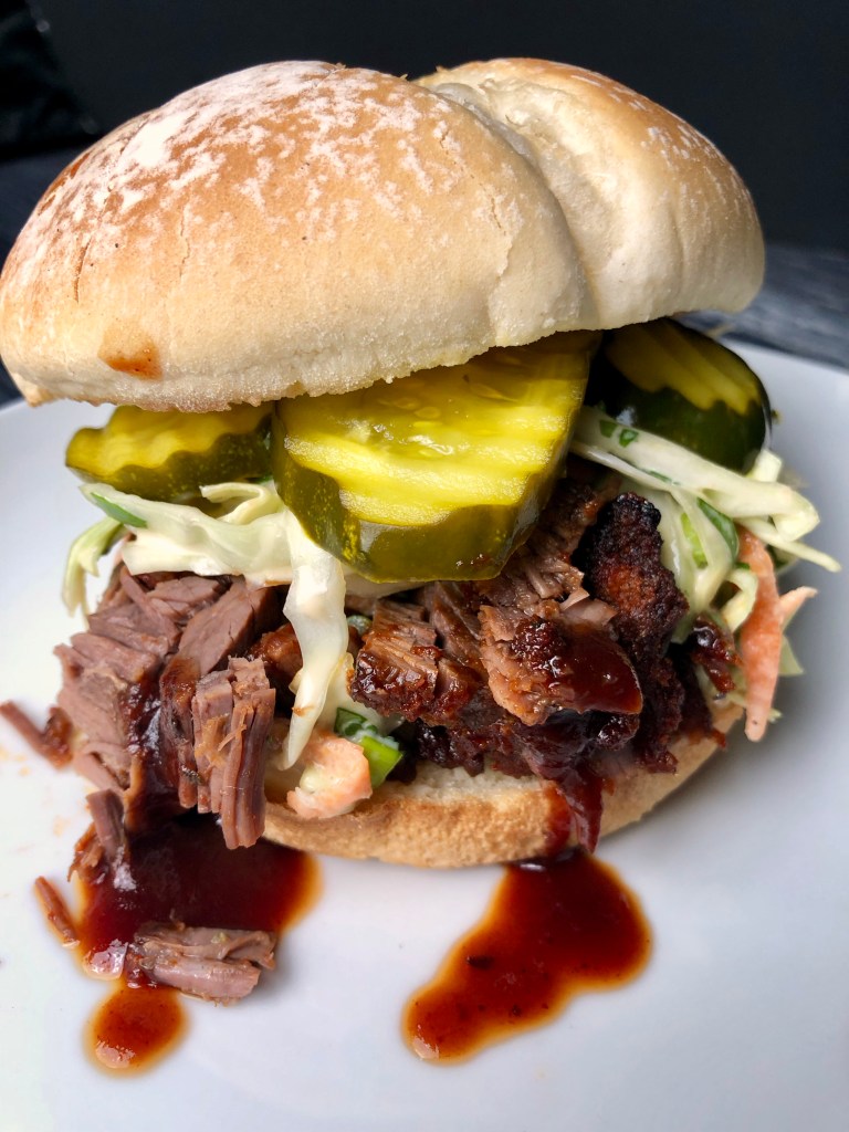 Lightly toast some hamburger buns or ciabatta rolls. Spread some mayo on one side, add the sliced brisket topped with extra BBQ sauce, add some of the ranch slaw, top with red onion and pickles.