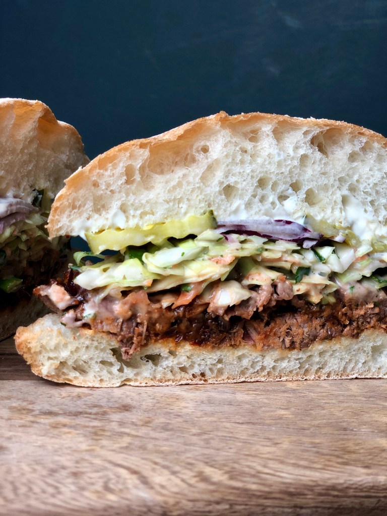 The sandwiches that I made with this brisket were sooo good. A big hit with the whole family. I bought two types of bread – ciabatta and hamburger buns. They were both great, it just depends weather you like a soft bun or crusty bread with your sandwich. I made a simple slaw with ranch dressing – BBQ and ranch dressing are a match made in heaven. Use your favorite ranch, or make one from scratch if you are feeling ambitious. I’m not a fan of the bottled stuff or the packet loaded with MSG but I love this one made with buttermilk and mayo.