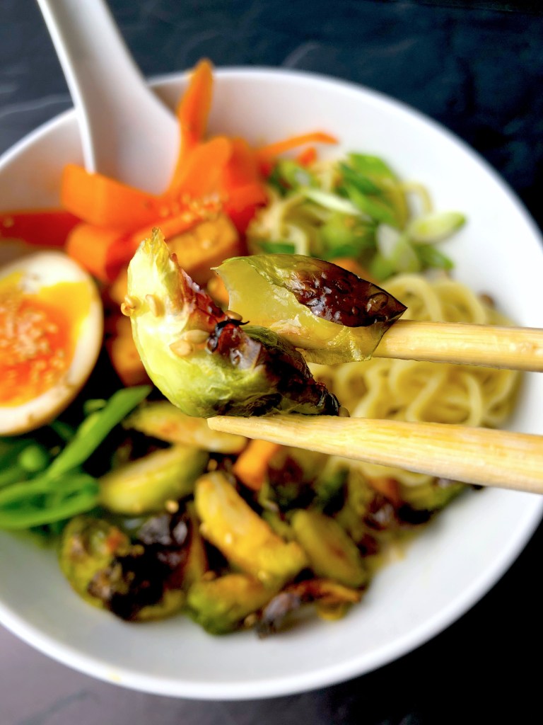 Next you need some veggies (although I would not be opposed to eating a giant bowl of just noodles and broth). This is where you can get creative and use whatever you or your family likes. I have used cabbage, broccoli, and bok choy. For this recipe, it was miso roasted brussels sprouts, which I have to say, took this ramen to the next level. Miso paste is one of my favorite Asian ingredients and adds so much flavor to sauces, dressings, or roasted veggies like these brussels sprouts. You can find miso paste in the refrigerated Asian food section (where you would find the tofu or fresh Asian noodles). A few sliced snap peas and shaved carrot completed the dish. Oh and don’t forget the shiitake mushrooms…they are a must in all ramen IMO!