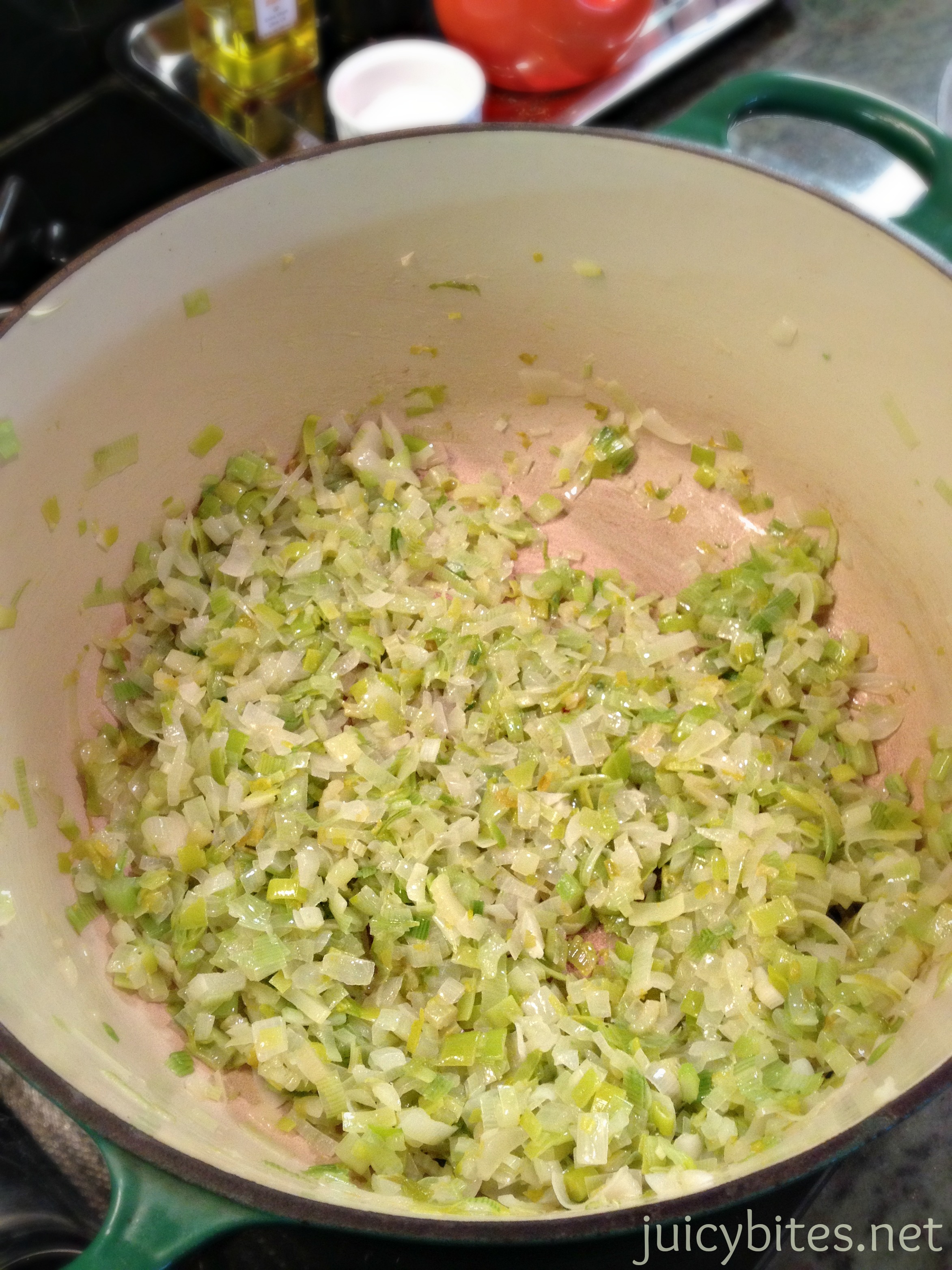 Lots of sauteed leek, onion, and celery give this soup great flavor. Make sure your veggies are nice and tender before adding the rest of the goods. Don’t rush this step because it is an important part of building the good flavor of this soup.