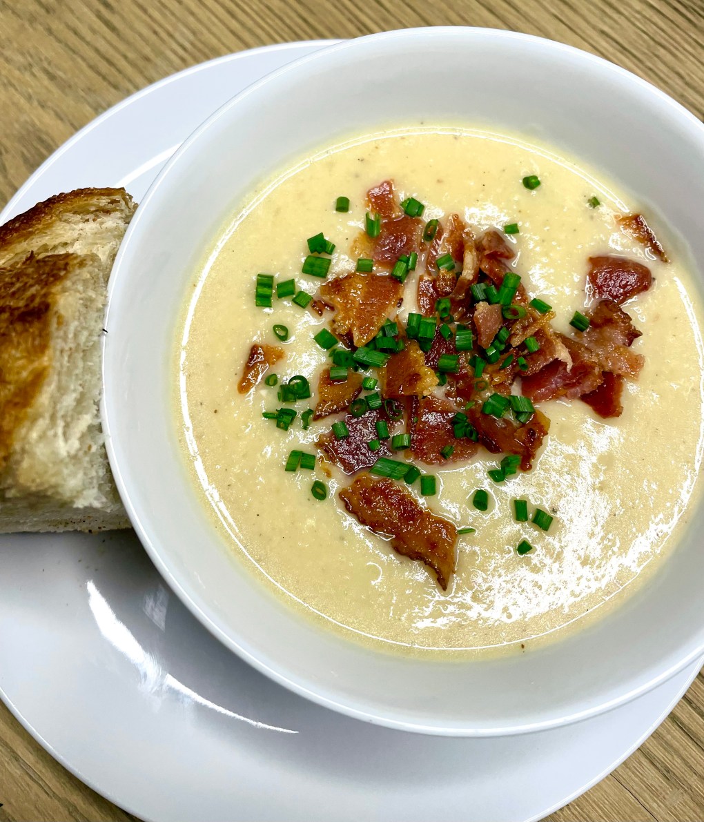 Add the potatoes and 5 cups of chicken broth (or bone broth) and bring to a boil. Reduce heat and simmer with a lid slightly cracked until potatoes are starting to get tender, about 10 minutes. Add the roasted cauliflower and continute to simmer with a lid on for 5 to 10 more minutes. Once potatos and cauliflower are very tender, puree the soup using an imersion blender or transfer to a regular blender and blend in batches. If soup is too thick, add the remaining broth until it reaches your desired consistancy. Add heavy cream or half and half and season to taste. Potatoes need a lot of salt…I added about another teaspoon and a half of salt at the end but that can vary depening on how salty your chicken broth is.