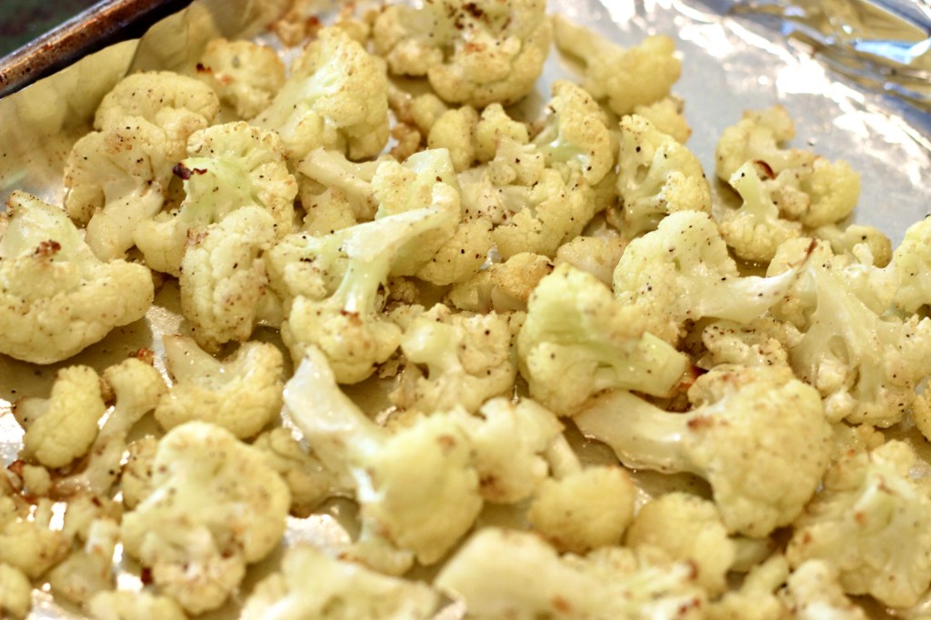 While bacon is cooking, prep the cauliflower. On a second sheet pan, toss cauliflower florets with 2 tablespoons of olive oil and season well with salt and pepper. Once bacon is done, raise oven temp to 425 and roast cauliflower until tender and starting to brown – about 15 to 20 minutes. Stir about half way through for even browning.