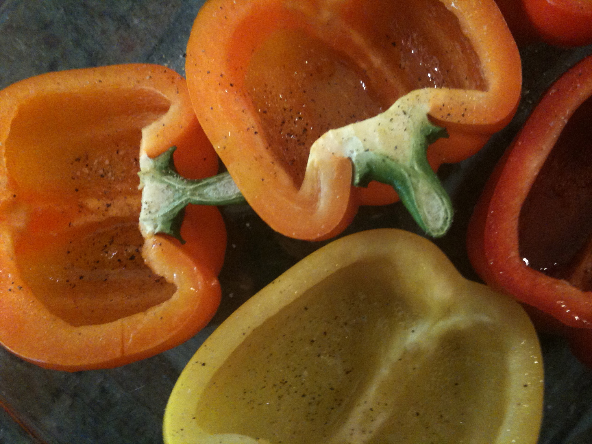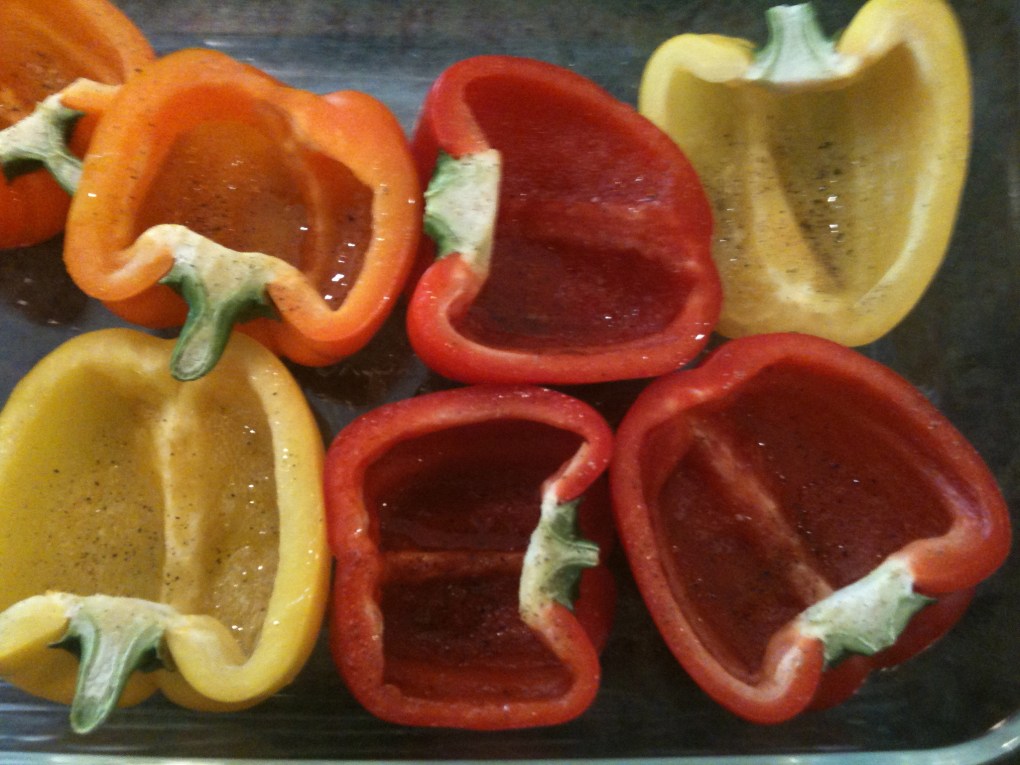 Cut your bell peppers in half lengthwise and clean out seeds and veins. Put in a baking dish with the cut side facing up (you will need 2) and drizzle with olive oil. Sprinkle with a little kosher salt and freshly ground pepper and bake for about 30 minutes.