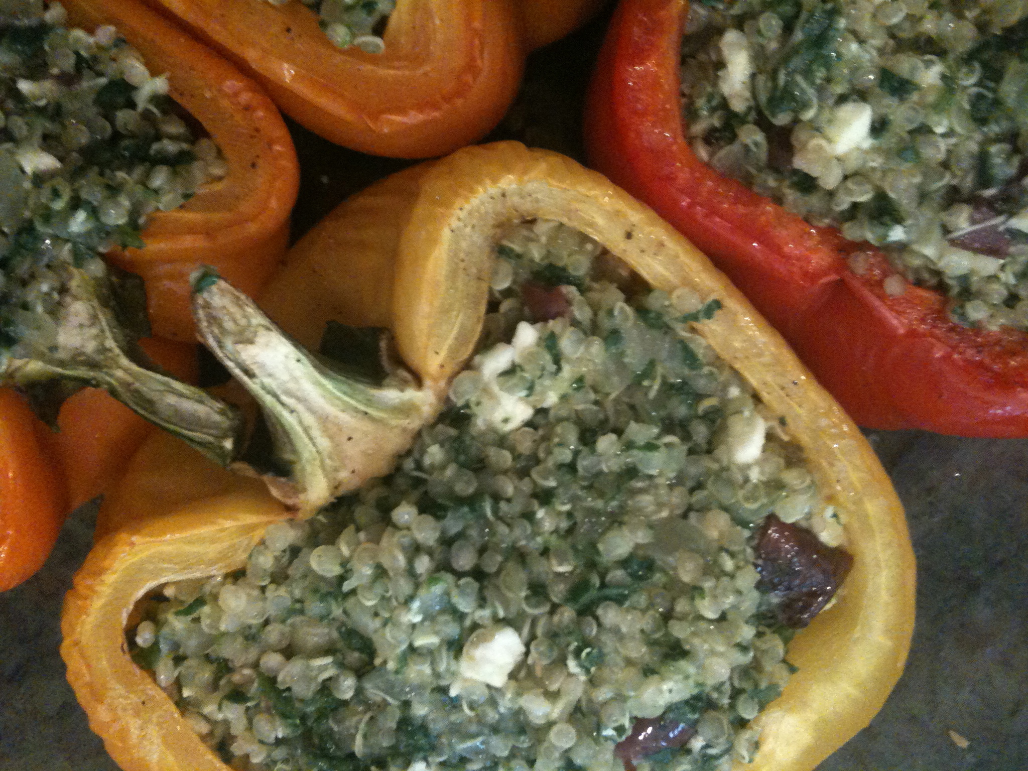 Peppers filled with quinoa/spinach mixture ready to go in the oven…