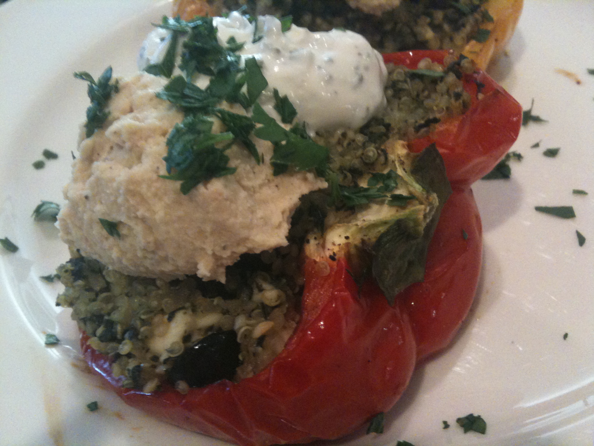 Remove the peppers from the oven, lower the oven to 350 degrees, and let them cool a bit. Stuff them with the quinoa mixture and return to the oven for about 20 more minutes. Since everything is cooked, they just need to cook until the peppers are as soft as you like them. Remove them from the oven, let cool for a few minutes, and top with hummus and yogurt dip and garnish with parsley.