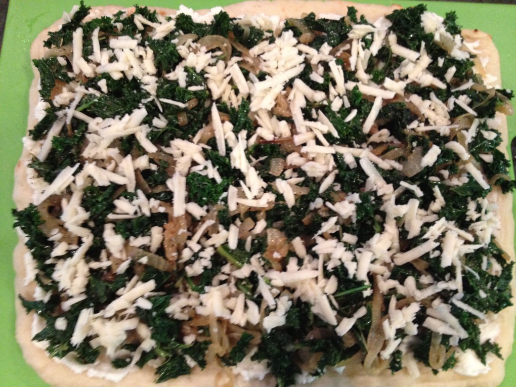 Start by sauteing your onion slices in a large frying pan with a few turns of olive oil over medium low heat. You want to cook them until they are lightly browned and very soft – about 20 minutes. Keep an eye on them and stir every so often to keep them from burning. Lower the heat if they are getting to0 brown. Once the onions are done, add the kale to the pan. You will need to do this a few handfuls at a time and add more as it cooks down. Season well with salt and pepper to taste and cook for about 10 minutes or until it is tender. If you happen to have a splash of dry white wine lying around, you could throw it in the pan and cook for a few minutes more (I always seem to have a splash of wine lying around 🙂 but if you don’t, skip it). Remove from heat and let cool for a few minutes while you start assembling the pizza.