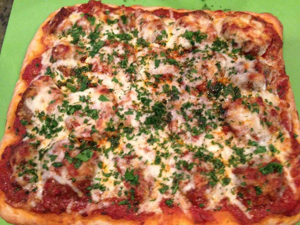 Now I know that right about now you are wondering…”But what about that meatball pizza she mentioned earlier??” Not to worry, I will tell you about the meatball pizza. I basically just threw my leftover meatballs and sauce on a pizza crust and covered it with shredded mozzarella cheese. It was really good!! I did slice the meatballs in thirds first because the were big. The leftover sauce made a perfect pizza sauce. I topped it with a little fresh chopped parsley.