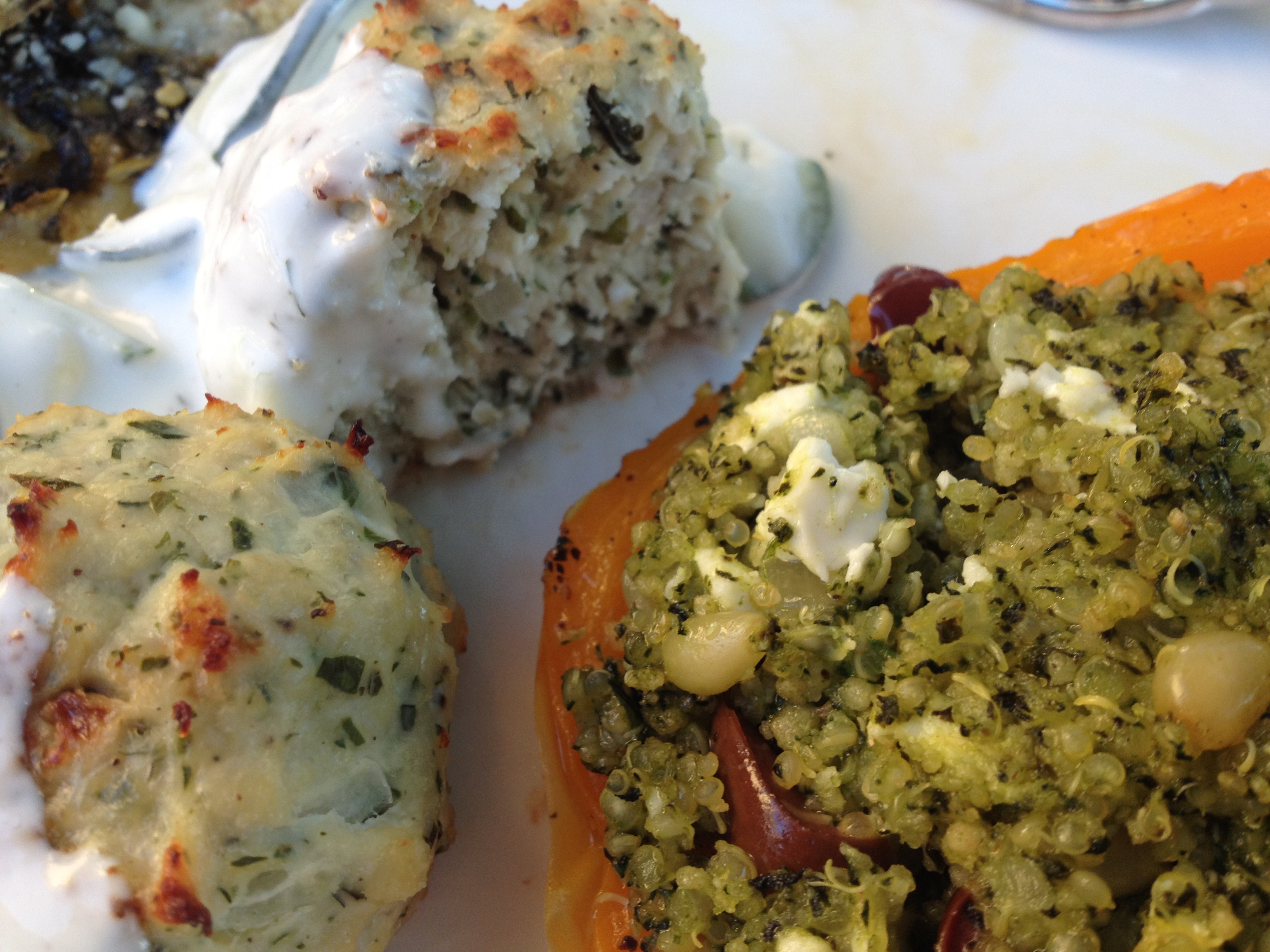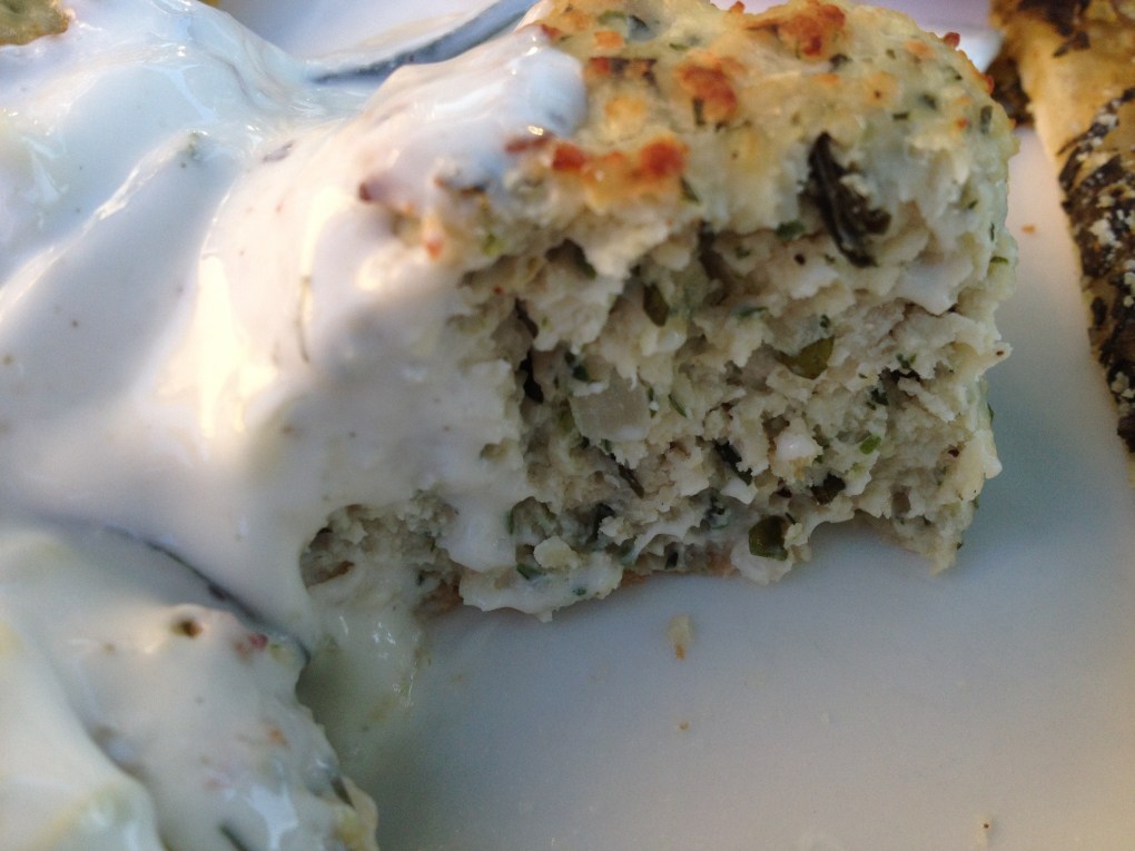 Pour the milk over the panko bread crumbs in a large bowl and stir until liquid is absorbed. Add ground chicken, chopped onion, minced garlic, all of the herbs, the feta, the beaten eggs, olive oil, lemon zest & juice, and salt & pepper. Mix well until all of the ingredients are combined. Shape about 3 tablespoons of the chicken into a balls (this is a messy process – a little water on your hands helps the chicken from sticking) and put on a baking sheet lined with foil and coated with non-stick cooking spray. Bake for about 20-25 minutes, turning them over half way through (test at 20 min to see if they are done on the inside). A minute under the broiler gives them a little more golden color…just don’t walk away! Serve with tzatziki sauce.