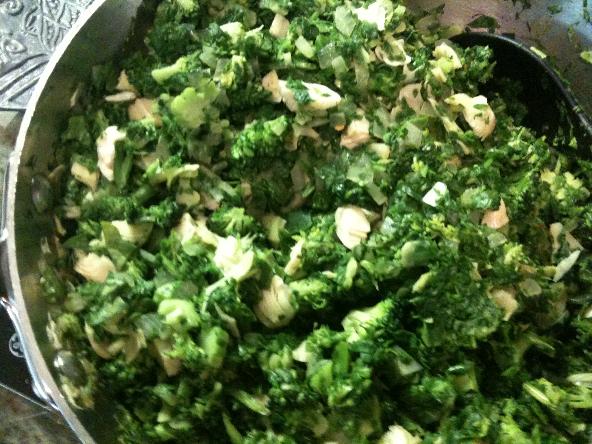 In a large saute pan, heat the olive oil and saute the onion for about 5 minutes. Add the broccoli and red pepper flakes (to taste) and saute for another 5 minutes. Add the spinach (in batches if necessary) and saute for another minute until it has wilted. You don’t really want to cook the veggies all the way, they will cook in the oven. Turn off the heat, add the artichoke hearts, 1 teaspoon of kosher salt and some fresh ground pepper and mix well.